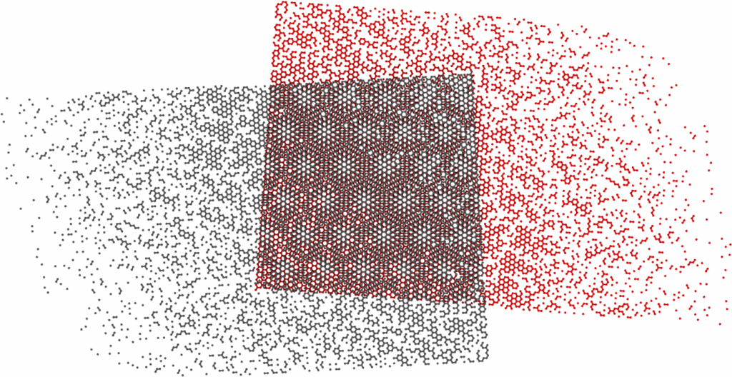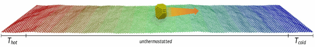 The figure shows isolated atoms that progressively bind together forming two hexagonal lattices, whose superposition forms a moirè pattern – the emergent complex phenomenon.Faceting superstructure appearing in monochiral (external) and bichiral (internal) double-wall nanotubes upon relaxation. [R. Guerra et. al, Nature Nanotechnology 2016, 11, 1082; Nano Letters 2017, 17, 5321]A thermal gradient applied on a graphene sheet will induce a thermophoretic force on an adsorbate cluster, directed from hot to cold and proportional to ΔT. [PNAS 2017, 114, E7035]