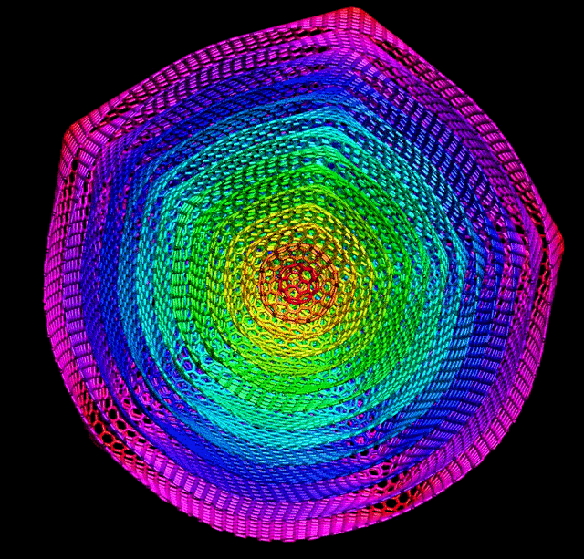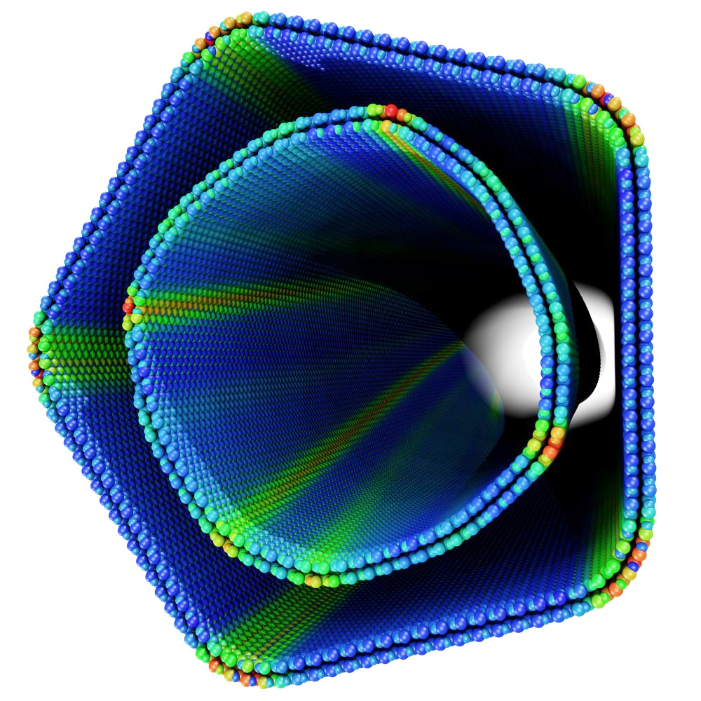 Graphene nano-onion (only a half is visualized) made by 14 concentric fullerenes (from C60 to C10140, 52920 atoms in total) and relaxed by MD simulation.